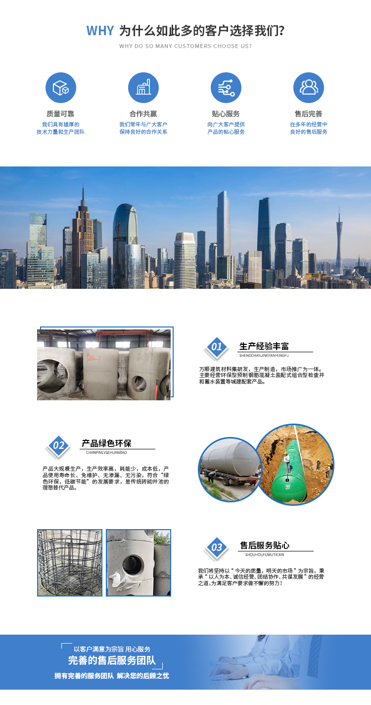 黃山市萬順建筑科技有限公司是集研發(fā),生產制造,市場推廣為一體的綜合性企業(yè)。公司主要經營環(huán)保型預制鋼筋混凝土裝配式組合型檢查井和蓄水裝置等城建配套產品。產品生產過程采用獨特的生產工藝,機械化流水作業(yè)。產品大規(guī)模生產,生產效率高,耗能少,成本低,產品使用壽命長、免維護、無滲漏、無污染,符合“綠色環(huán)保,低碳節(jié)能”的發(fā)展要求,是傳統磚砌井池的理想替代產品。